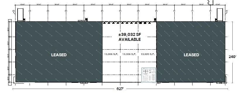 Available SF: 39,032 Office SF: 2,102 Building Depth: 240’ Typical Bay Size: 13,006 SF Column Spacing: 54’ x 50’ Clear Height: 36’ Dock Doors: 11 - 9’ x 10’ Truck Court: 185’ Fire Protection: ESFR Power: 1,000 A Auto Parking: 30 Trailer Parking: 22